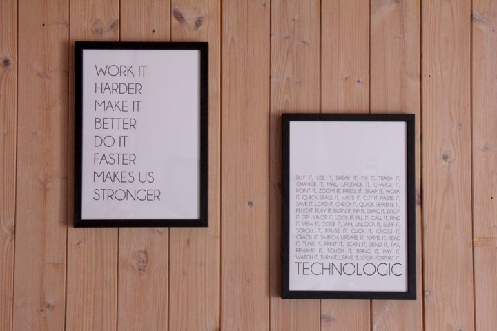 En grande fan de Daft Punk, je cherchais depuis quelques temps des affiches sympa avec des citations de chansons. Après avoir fait le tour de l’internet, j’ai décidé de les créer moi-même. Une page word, une police assez simple, une imprimante, des cadres shoppé sur Desenio et me voilà avec deux cadres qui s’accordent parfaitement au-dessus de mon lit !